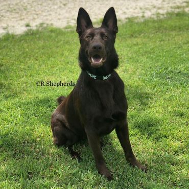 Elysian is a liver colored GSD out of Sanrock Sean Thornton and Gemma Von Hyde-Simpson.